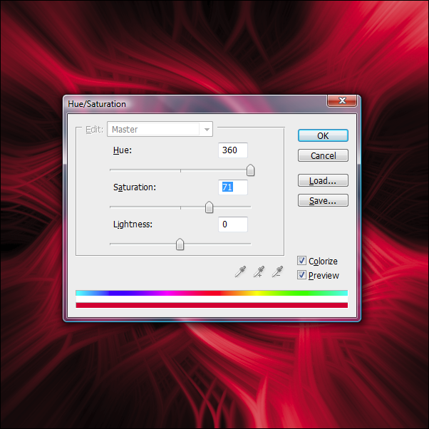 In dit geval moeten we het plaatje kleur geven door op CTRL + U te drukken (Deze stap kunnen we overslaan wanneer we zijn begonnen met een kleur!)